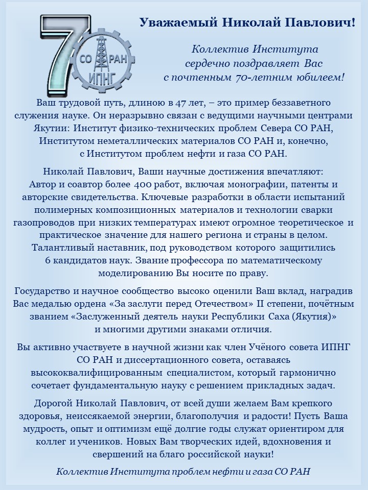 Поздравляем с 70-летним юбилеем доктора технических наук, профессора Николая Павловича Старостина!